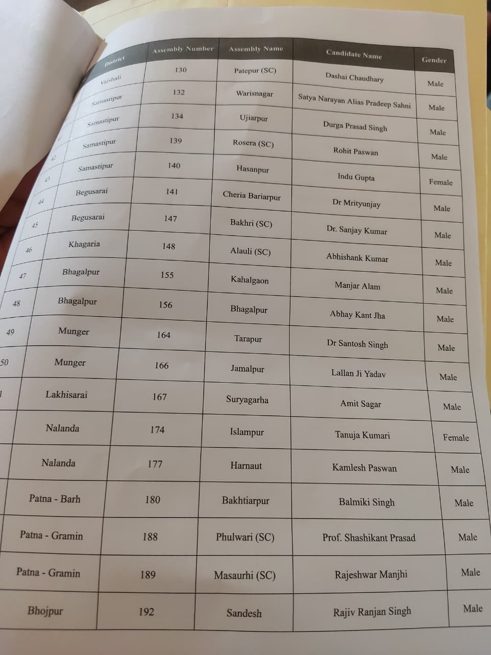 इस सूची में, अतिपिछड़ा वर्ग से 17 उम्मीदवार (16 हिंदू और 1 मुस्लिम), अन्य पिछड़ा वर्ग से 11 उम्मीदवार, सामान्य वर्ग से 9 उम्मीदवार और अल्पसंख्यक वर्ग से 7 उम्मीदवार हैं. इसके अलावा, पार्टी ने वाल्मीकिनगर विधानसभा सीट से एक अनुसूचित जनजाति उम्मीदवार को भी टिकट दिया है.