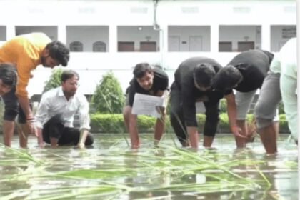 महात्मा गांधी काशी विद्यापीठ विश्वविद्यालय में छात्र नेताओं ने जल जमाव का विरोध करते हुए लगाए धान