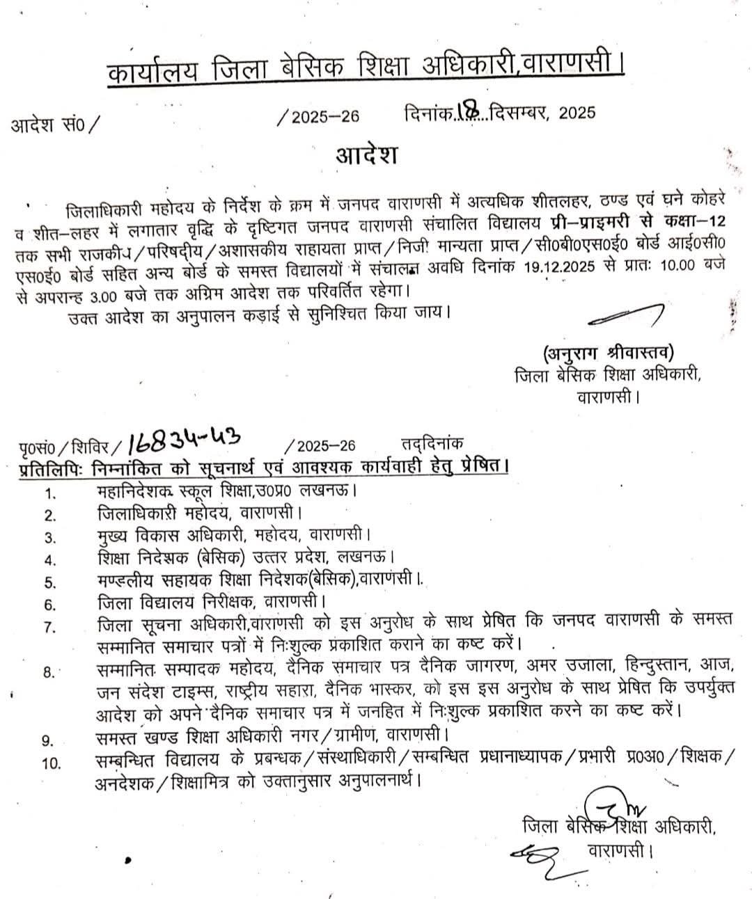 वाराणसी में बढ़ती ठंड और घने कोहरे को देखते हुए स्कूलों का बदला समय